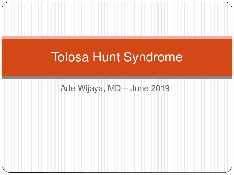 Tolosa Hunt syndrome THS is a rare condition characterized by painful ophthalmoplegia paralysis andor weakness of the eye muscles. TolosaHunt syndrome of painful ophthalmoplegia is caused by idiopathic granulomatous inflammation with epithelioid cells and occasional giant cells anywhere from the orbit to the superior orbital fissure and cavernous sinus. Synonyms for Tolosa Hunt syndromeinclude painful ophthalmoplegia recurrent ophthalmoplegia ophthalmoplegia syndrome. Tolosa-Hunt syndrome is a severe unilateral periorbital headache and ophthalmoplegia resulting from a non-caseating granulomatous inflammation of the cavernous sinus andor superior orbital fissure. Tolosa-Hunt syndrome TH is a variant of the disease with involvement of the orbital apex and extension into the cavernous sinus. This case report presents a patient diagnosed with Tolosa-Hunt syndrome THS after an extensive neuro-diagnostic and neuroimaging evaluation. The Tolosa-Hunt syndrome L B Kline W F Hoyt Defining the syndrome The syndrome of painful ophthalmoplegia consists of periorbital or hemicranial pain combined with ipsilateral ocular motor nerve palsies oculosympathetic paralysis and sen-sory loss in the distribution of the ophthalmic and occasionally the maxillary division of the trigeminal nerve. Tolosa-Hunt syndrome THS is a painful ophthalmoplegia caused by nonspecific inflammation of the cavernous sinus or superior orbital fissure. The Tolosa-Hunt syndrome is a rare syndrome with an estimated annual incidence of one case per million per year 1.