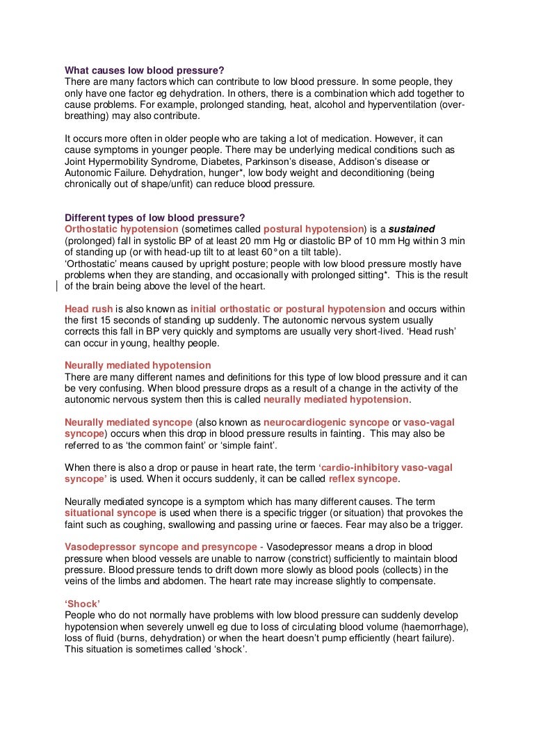 The most common type experienced by people with Parkinsons is orthostatic or postural hypotension. We present the case of a 78-year-old man with PD who had hypotensive shock and extreme fluctuations of BP. How to deal with low pressure in Parkinsons disease. I have had no issues with this at all. This 7-page fact sheet PDF was developed for people affected by MSA but is just as useful to those with Parkinsons disease who are experiencing drops in blood pressure and postural hypotension. It is difficult to control BP when hypertension coexists with these complications. Many people with mid and late-stage Parkinsons experience low blood pressure known as hypotension. Stop or reduce the consumption of alcohol and hot drinks. The symptoms of low blood pressure can include.