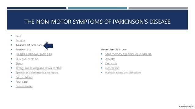 The symptoms of low blood pressure can include. Patients with Parkinsons disease PD often have dysautonomia and neuropsychiatric and sleep disorders which influence BP. Low blood pressure that is experienced when changing positions eg moving from lying down or sitting to standing up.